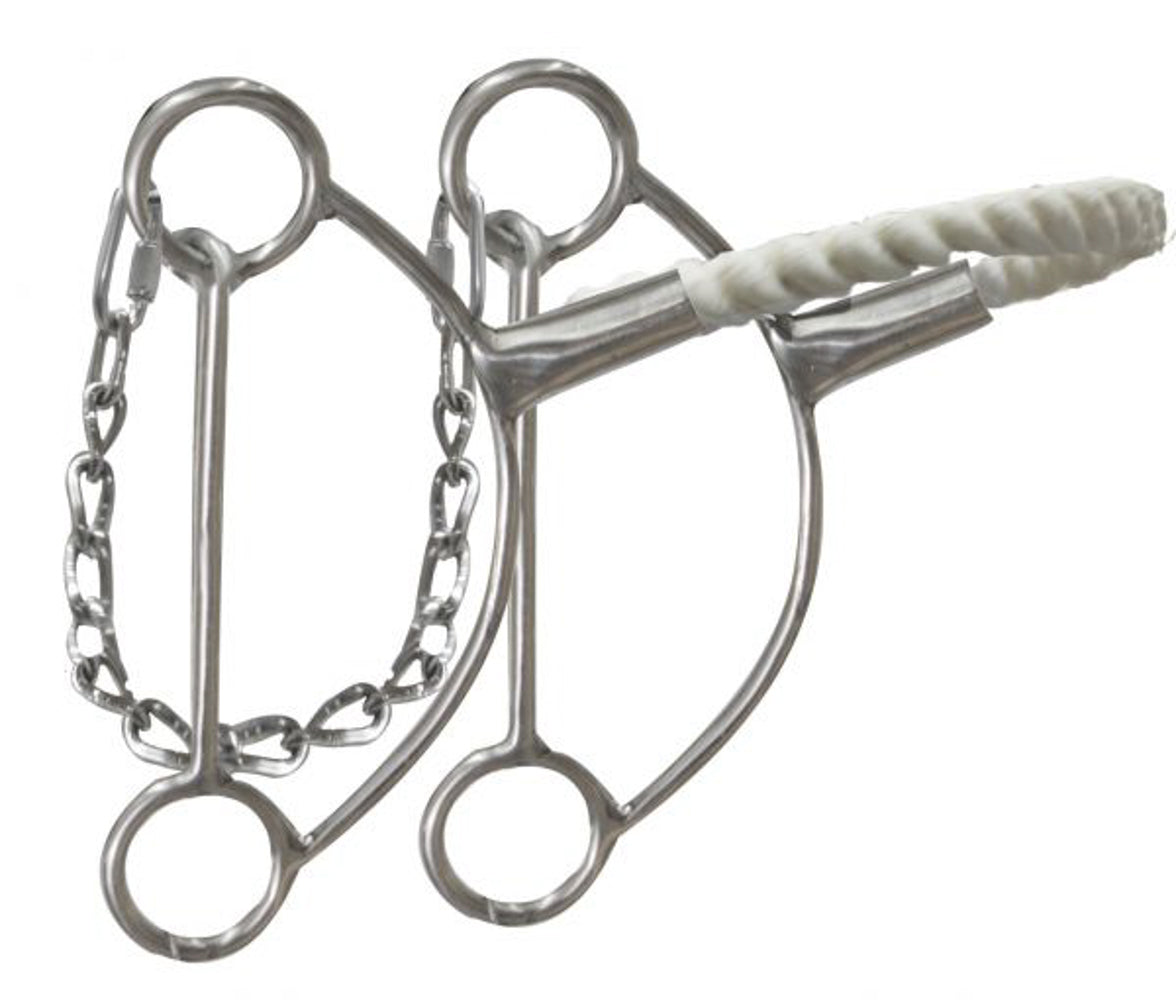 PRODUCT DESCRIPTION: Showman® Stainless Steel Hackamore with Wax-Coated Twisted Rope Noseband