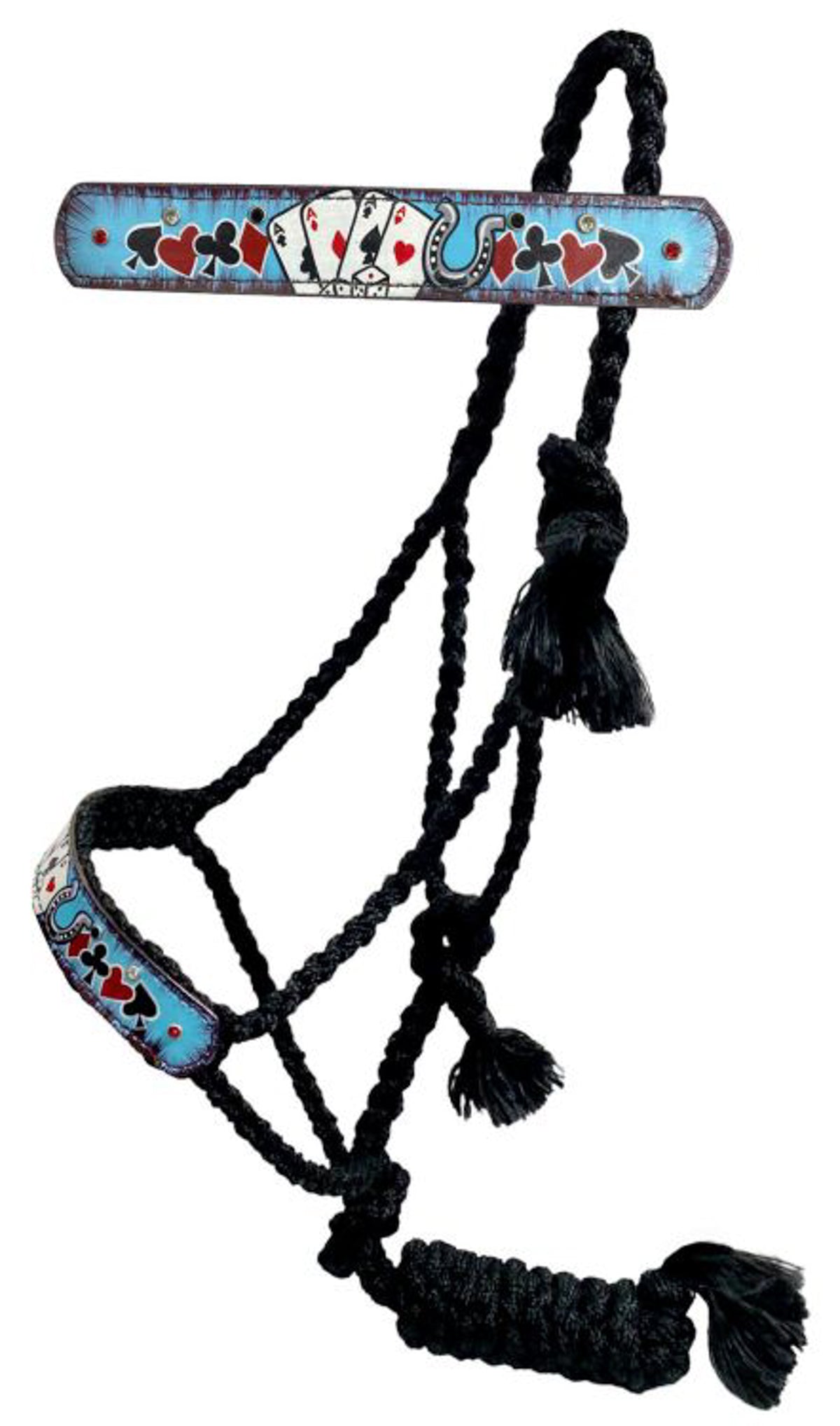 Showman® Electric Aces Woven Black Nylon Mule Tape Halter has a leather nose covered in an electric blue playing card design.