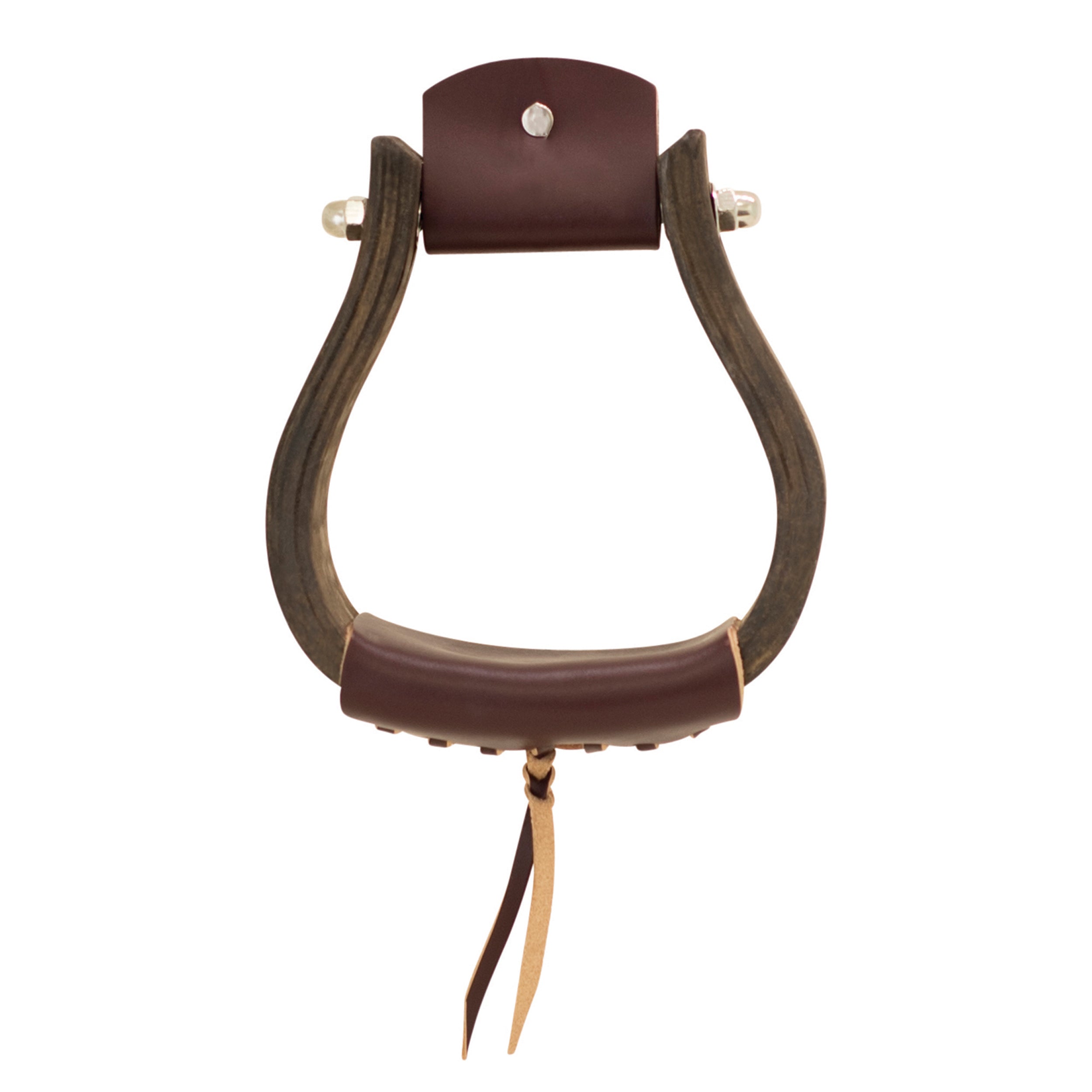 The Metalab Open Range 3 1/4" Wooden Bell Stirrup is made of dark wood with a dark leather-wrapped footpad. A 3" to 4" leather tassel hangs at bottom center.