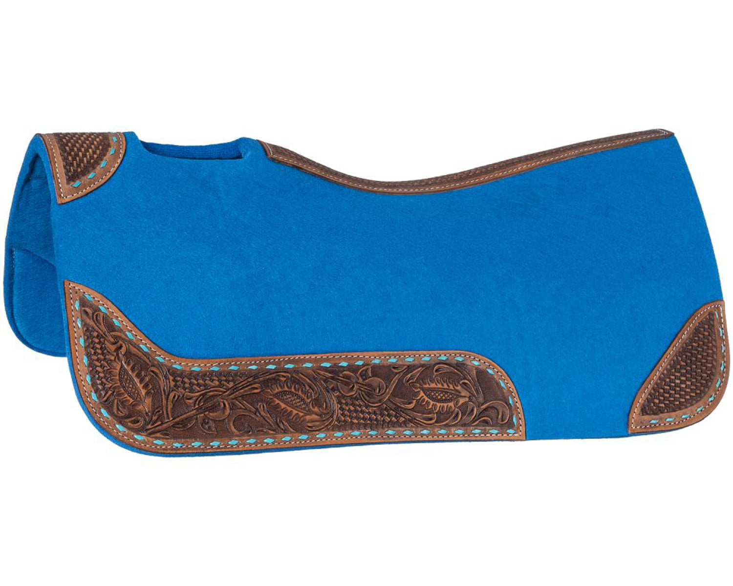 This Tough-1® Buckstitch Barrel Saddle Pad is designed with a wither relief opening and contour shape for close and correct saddle fit. The ¾” felt provides superior wicking properties as well as great shock-absorption while riding. Features hand tooled floral and basketweave leather accents with buckstitching details.