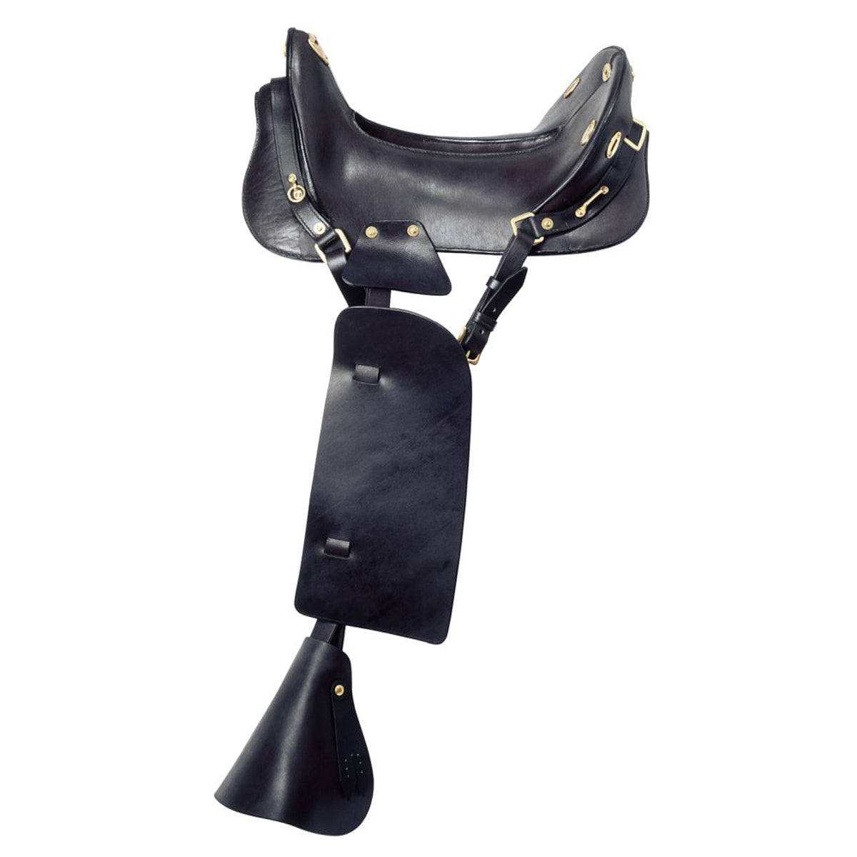 - Complete with protective stirrup fenders, leather-hooded metal stirrups and brass fittings.
