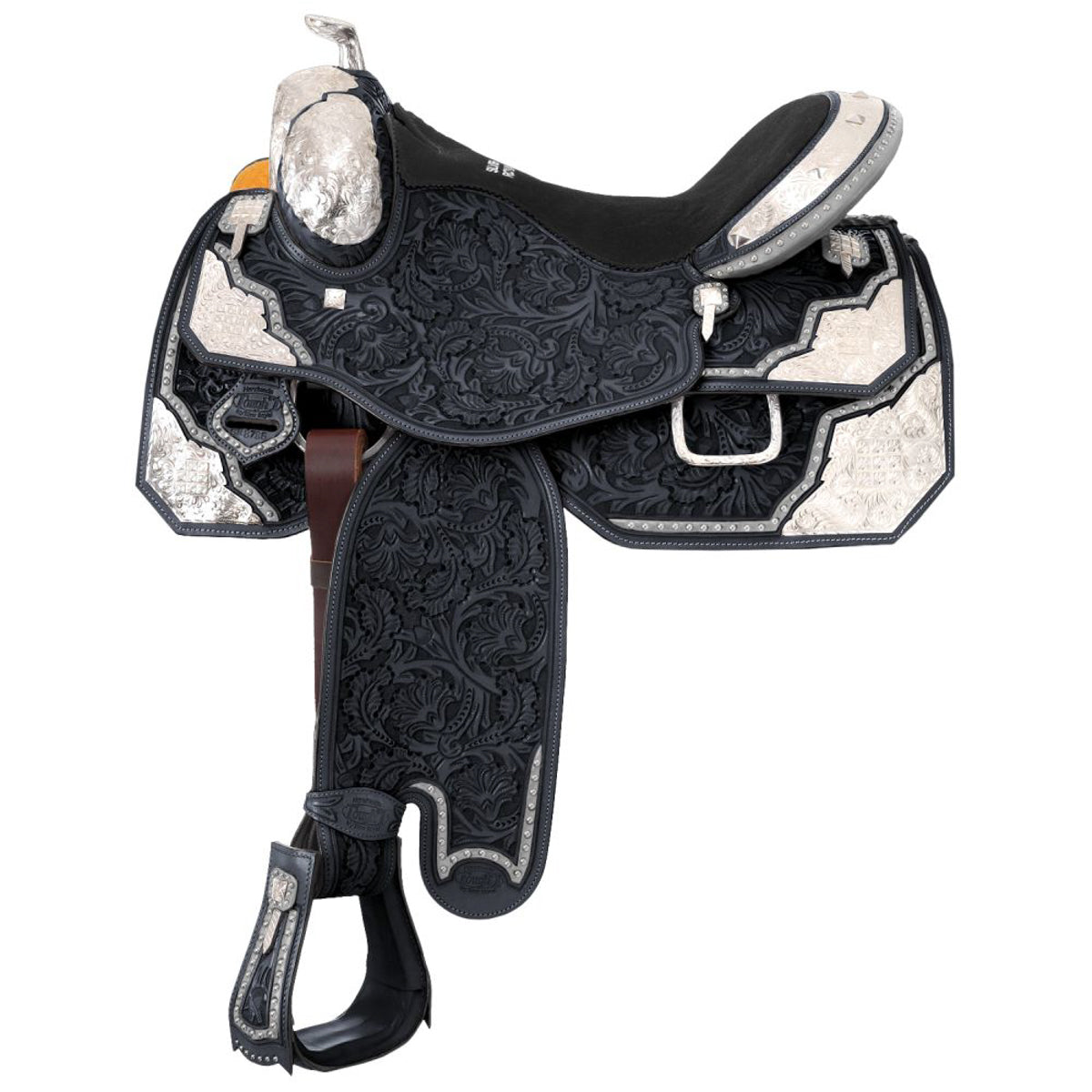 Silver Royal Extreme Silver Show Saddle is simply gorgeous in expertly tooled, premium black leather with stunning silver accents. No detail was forgotten!