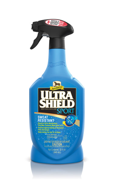 Absorbine® UltraShield® Sport Insecticide & Repellent for horses is a sweat-resistant formula ideal for use in hot, humid weather and during intense workouts. It is effective against nuisance and biting flies, gnats and mosquitoes (Culex species) and stays active for up to 14 days. A water-based formula, it gives horses' coats an oil-free shine without attracting dust.