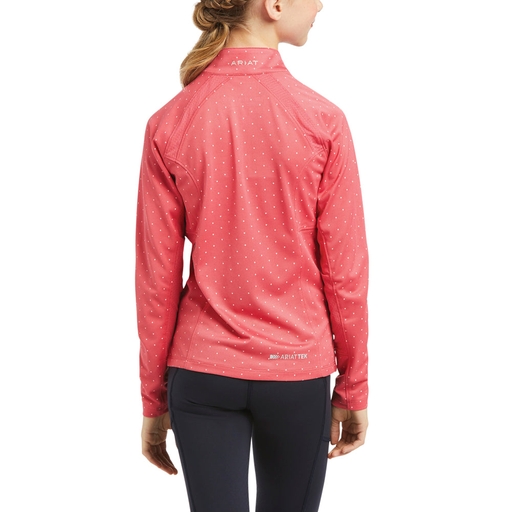 Extremely comfortable and protective, this Ariat® Kids´ Print Sunstopper Shirt offers UPF 50+ coverage. Lightweight stretch piqué knit fabric made with recycled polyester is athletically styled with a zip placket and stand collar. Breathable mesh paneling cools the young rider where it is most needed, and raglan sleeve construction allows optimal freedom of movement.