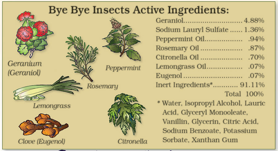 Active ingredients include geraniol, rosemary, citronella, peppermint and lemongrass. All ingredients meet the Environmental Protection Agency’s (EPA) 25(b) Minimum Risk requirements. Rosemary, peppermint, vanillin and lemongrass are all food-grade quality.
