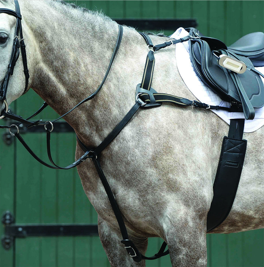 Attaches to a saddle at five points to reduce slipping. Removable martingale attachment.