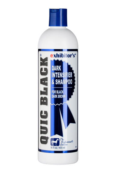Exhibitor’s™ Quic Black® intensifies black and reduces reds in black coats. Imparts saturated, rich color and highlights. Restores color to clipped or sunburned coats. Removes scurf with deep-cleaning, easy-rinse formula. Contains no harsh chemicals and has a neutral pH. 14 oz.