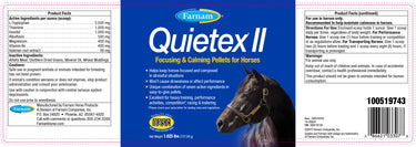 Farnam® Quietex II™ Focusing & Calming Pellets is an easy-to-feed supplement designed to help keep horses calm, focused yet alert during training. This calming supplement has a unique combination of seven active ingredients, including L-tryptophan, thiamine, inositol, riboflavin, magnesium, vitamin B6, valerian root extract. Feed 1 ounce daily (scoop enclosed), or at times of stress, such as trucking. 1.625 lb.