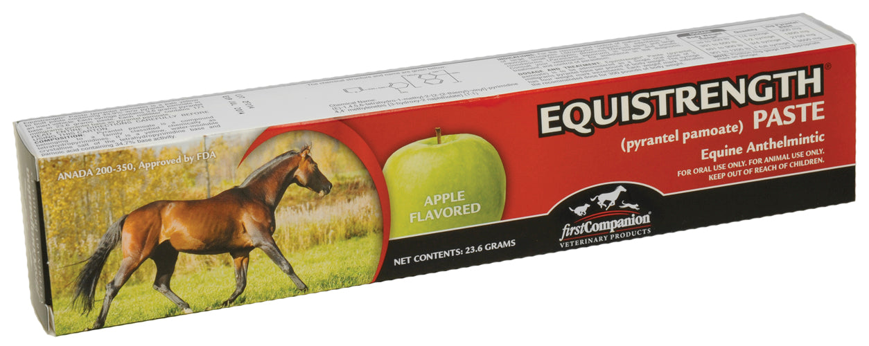 First Companion® Equistrength® (Pyrantel Pamoate) Paste is an apple-flavored equine anthelmintic. This pyrantel-based oral dewormer helps control small and large strongyles, roundworms, redworms and pinworms in horses and ponies when used as part of a worming program. It will also control tapeworms when used twice yearly at double the recommended dose.