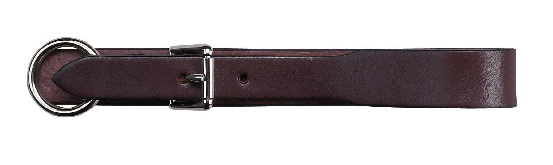 Girth Loop With Buckle slips onto girths that don't have center D-rings. Innovative loop has a buckle on top for easy on and off without undoing the girth. Stainless steel ring for attachment of training aids. Brown.