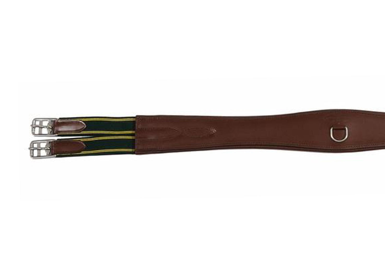 With this Henri de Rivel Advantage Overlay Girth, double elastic at each end allows for even pressure, and stainless steel roller buckles make smooth adjustments. This classic, contoured leather girth is shaped for horse comfort and features a center D-ring for martingale attachments. Stands up to regular training and offers show-ring quality.