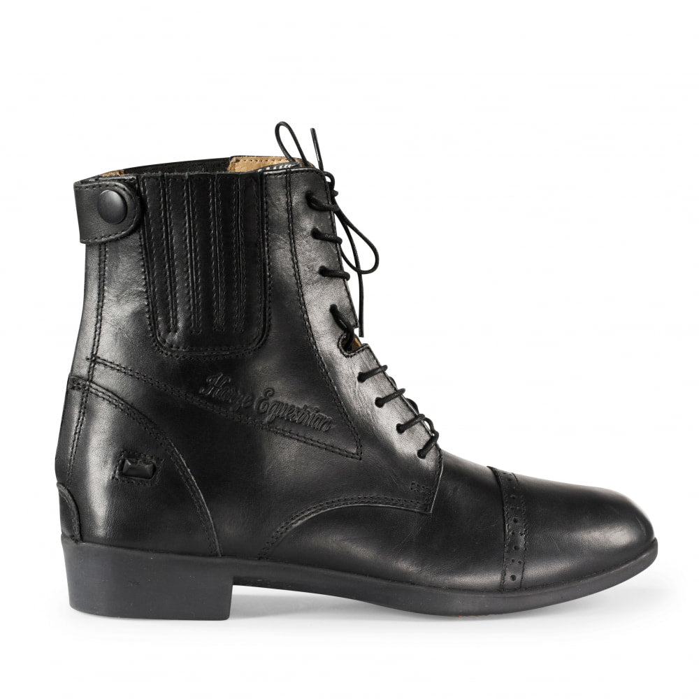 Horze Hamptons Leather Paddock Boots have laces in the front and zipper in the back for a traditional look combined with updated convenience. Features include a soft and comfortable sole that is sturdy and supportive, elastic at the top of the boot that adds style and stretch, and snap closure for easy on/off. Fancy-stitched toes and the Horze Equestrian name embossed on the side add style to coordinate with any collection.