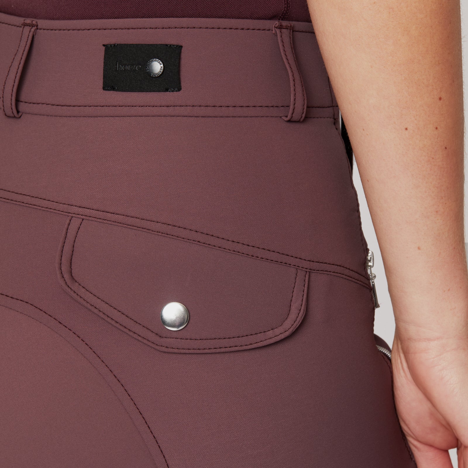 Pretty, supportive and comfortable, the Horze Andrea Slimming High-Waist Knee-Patch Breech has flattering seams down the front that elongate the look of your legs. Three-button waistband buttons is higher in the front, adding a stylish detail. Two zippered pockets offer space for your belongings, and the silicone knee patches aid your riding.