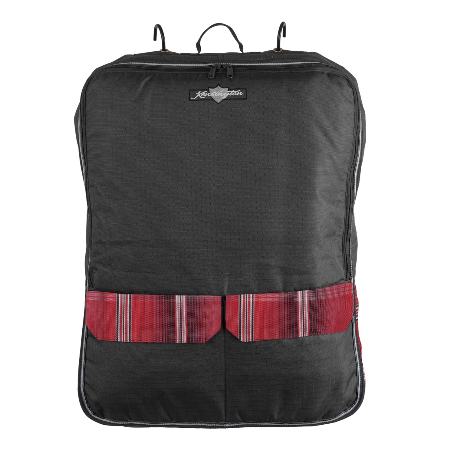 Kensington™ Signature Pony/Horse Harness Bag with 4 Adjustable Straps offers a stylish solution for storing, packing and protecting your harnesses. It features a 1200 Denier ripstop waterproof and breathable outer shell with beautiful plaid Textilene® inserts. Quilted, hollow fiber fill padding provides an additional protective layer and color coordinated hardware provides an elegant finish. Includes 4 interior straps to hang your harness, 2 metal hooks on the exterior for easy moving, mesh bottom for added breathability and 2 exterior pockets.