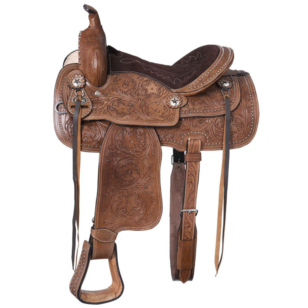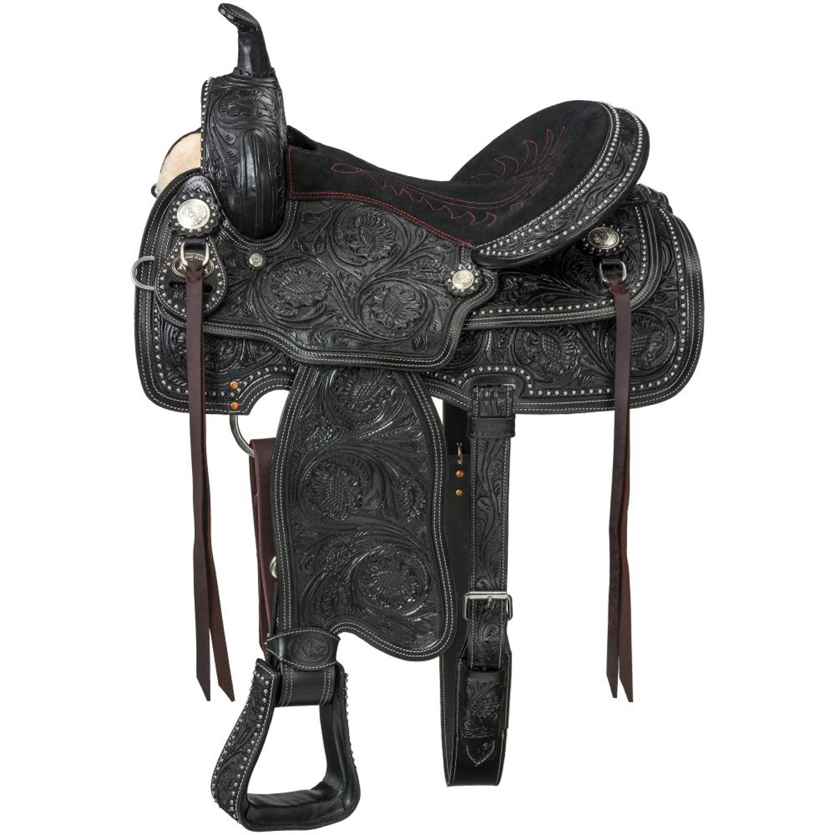 - Hand-tooled floral and leaf designs from horn to stirrup.