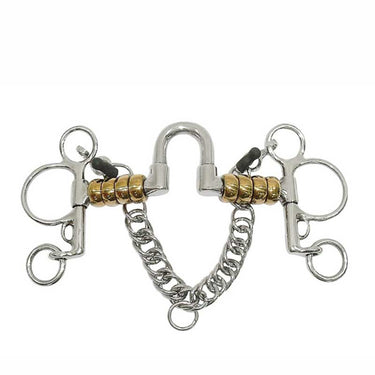 The Metalab Correction Pelham Bit is a Level 5 design in stainless steel. The 5 1/4" mouthpiece has copper cherry rollers and a sliding high port. Pelham cheeks and curb chain.