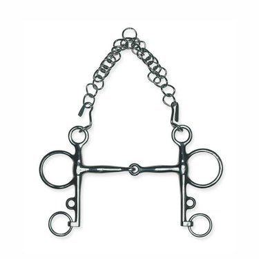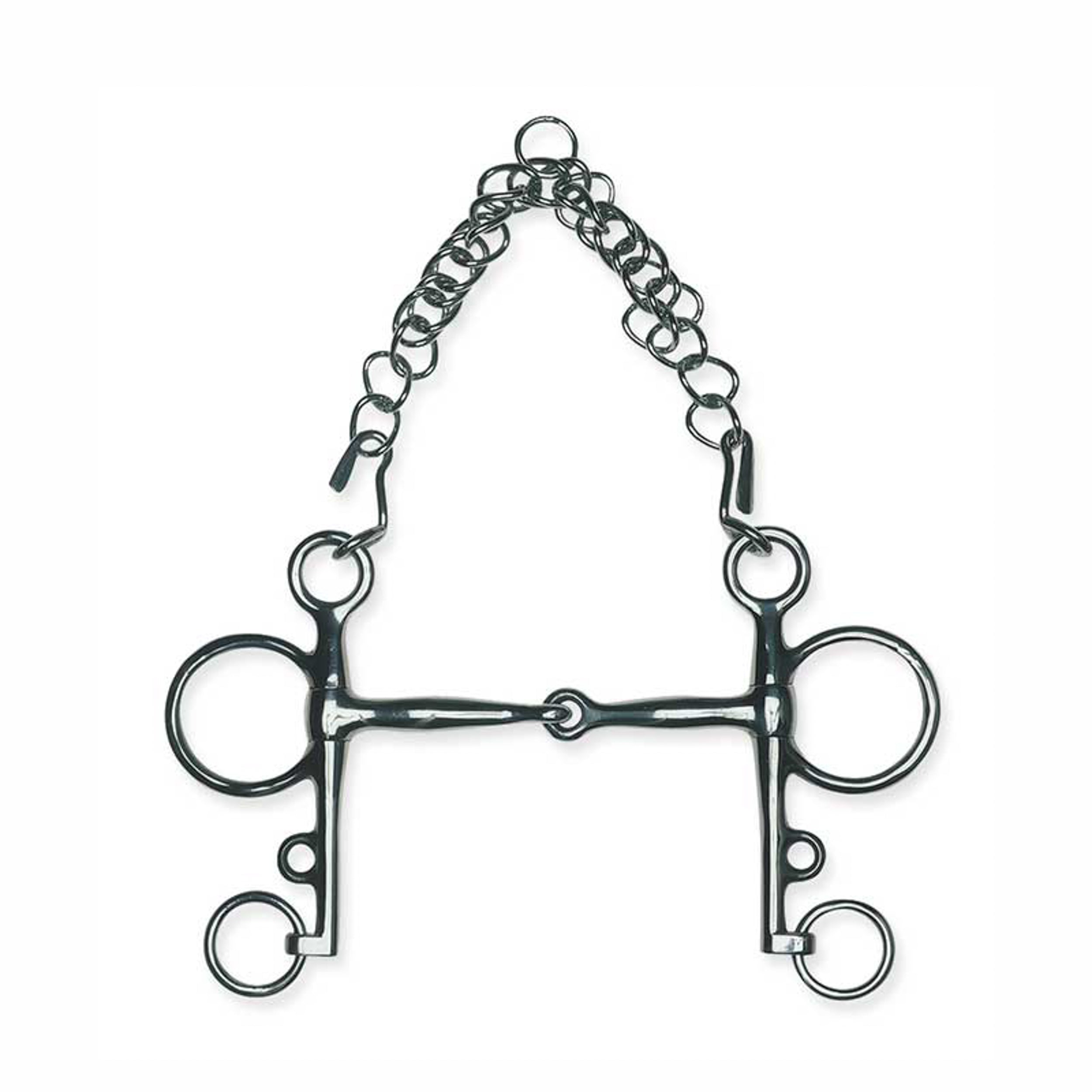 This Metalab Solid Jointed Pelham is a Level 3 bit made of stainless steel. Solid mouthpiece is 13mm diameter. Cheeks are 5 1/2". Curb chain and hooks included.