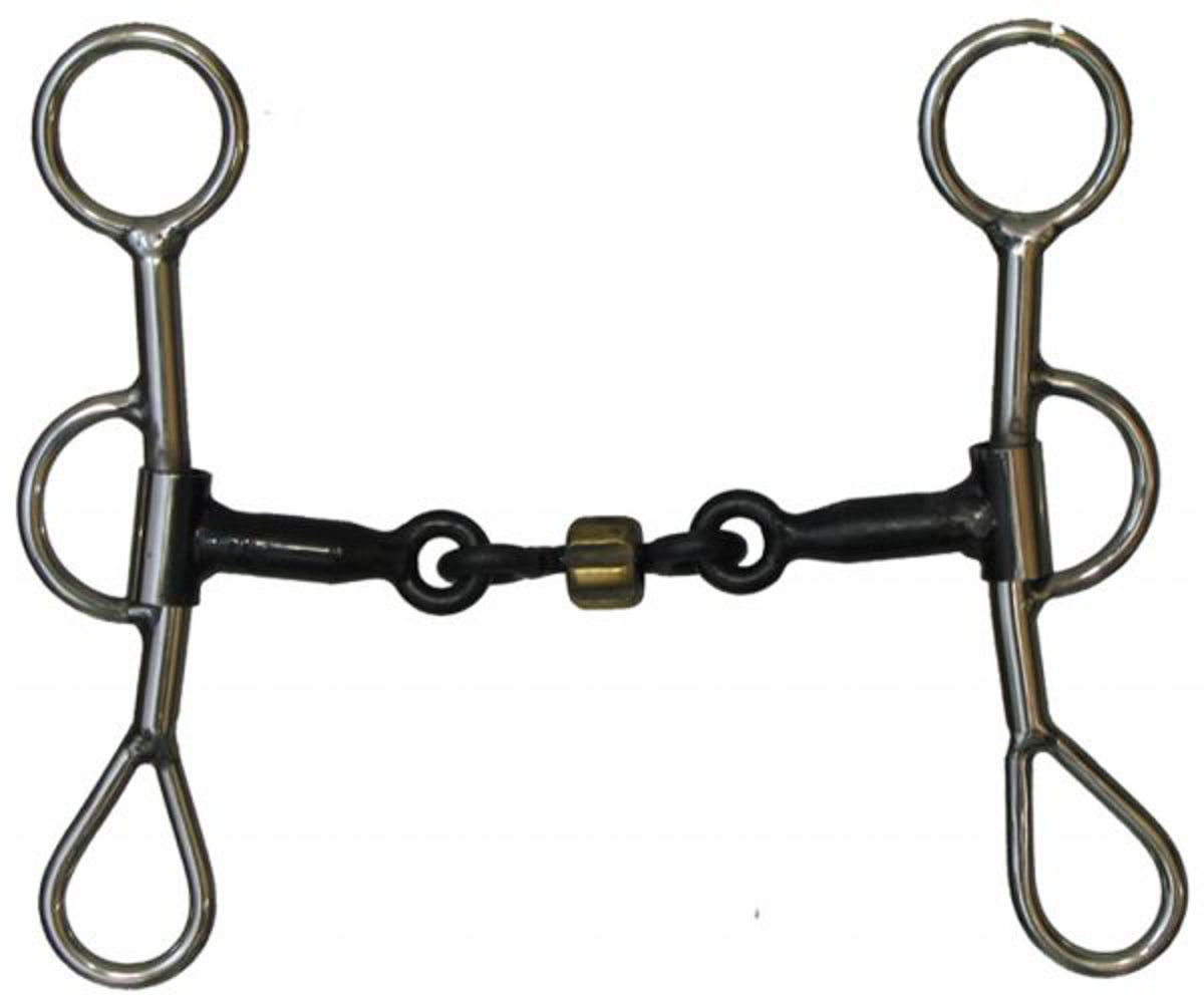 Showman® Stainless Steel Colt Snaffle Bit has a 5" sweet iron three-piece mouthpiece with a center dog bone and copper roller.