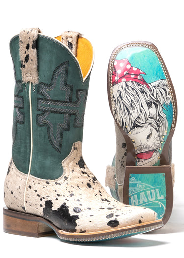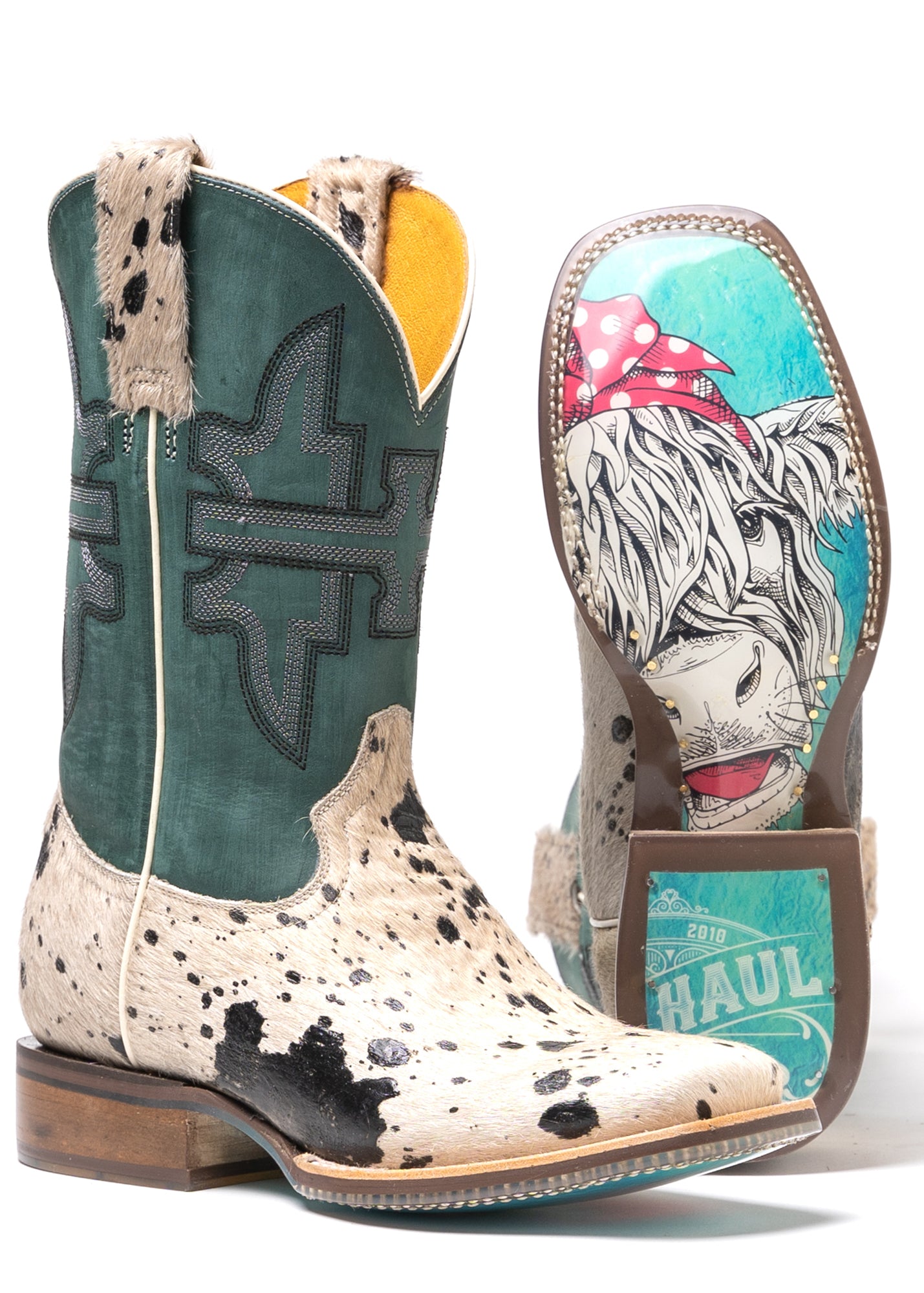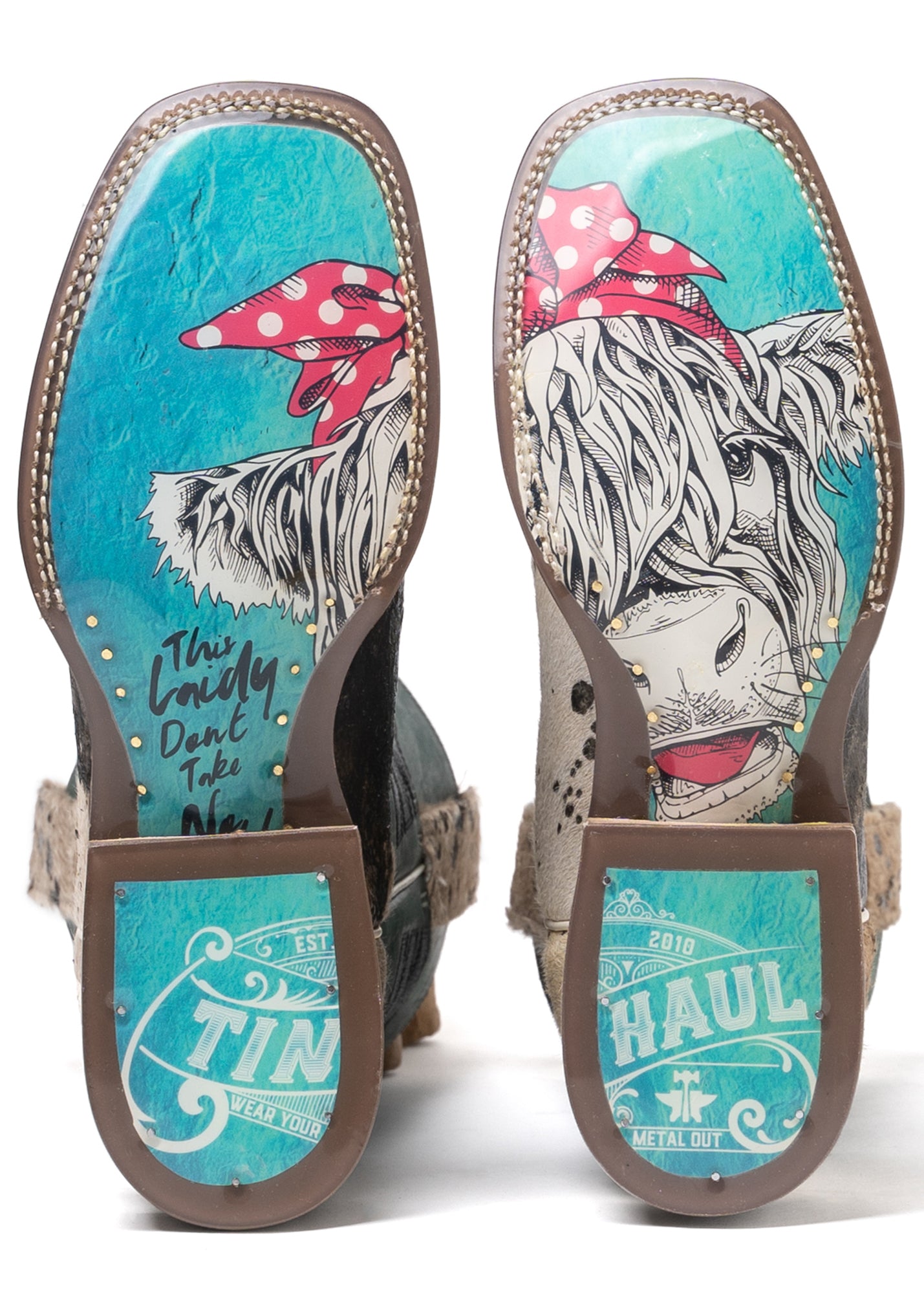 Cowgirl chic, the handcrafted Tin Haul Ladies’ Shaggy Spot, Priceless Sole Boot pairs a hair-on hide vamp with an oily turquoise shaft that has hair-on pulls and stitching. Square toe, leather lining and Cushion Comfort Non-Removable Insole combine to provide comfortable wearing. Transparent Sole features a cow graphic.