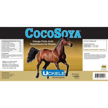 Uckele™ by SmartPak® CocoSoya® Health and Nutrition supports your horse’s overall health and improves natural hair sheen with its blend of highly digestible, unrefined soybean oil and coconut oil selected for natural fatty acid balance. It is a natural source of Omega-3, Omega-6 and Omega-9 fatty acids as well as vitamin E. CocoSoya is 20% more digestible and economical than vegetable oil. Used as a replacement for corn oil and vegetable oil, it increases slowly-metabolized calories in the diet and stabilizes blood sugar. Highly palatable, CocoSoya also replaces the need to add molasses to feed for picky eaters and it reduces dust in feed bin. CocoSoya retains tocopherol (vitamin E) and sterols present in crude unrefined oil—no chemical solvents are involved. The thick substance that sometimes settles to the bottom of the container is the natural lecithins (phospholipids) and tocopherols of the soy bean oil. It is a highly nutritious portion of the product, so shake the oil well before administering to keep the lecithin & tocopherols in suspension.