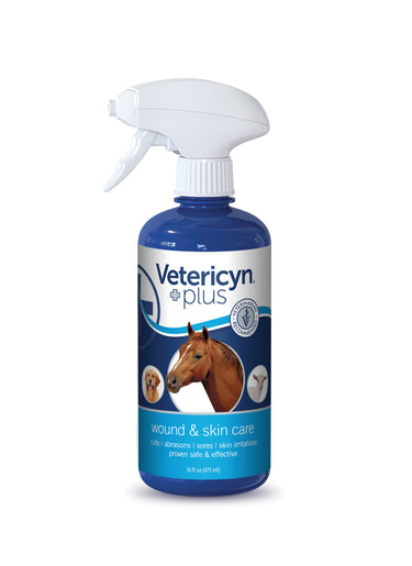 Vetericyn Plus® Wound & Skin Care Liquid for horses and other animals helps relieve pain and jump-start healing. This wound care spray can be used to clean, flush, moisturize and help prevent infection in wounds, cuts and abrasions, all without caustic ingredients. Steroid- and antibiotic-free, this wound treatment does not sting when applied.