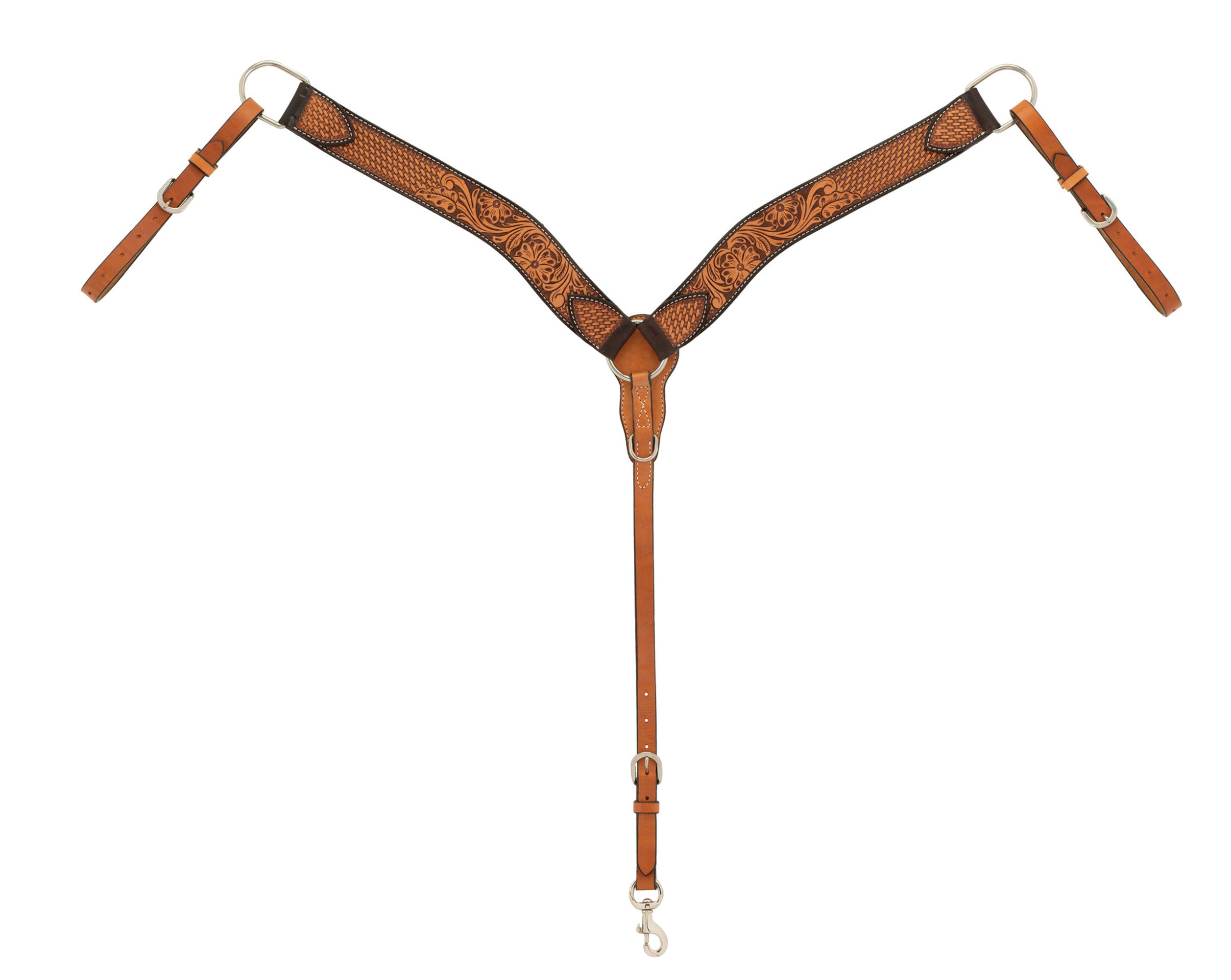 Weaver Leather® Turquoise Cross Floral-Tooled Contoured Breast Collar is made from light-oiled leather. An antiqued finish highlights basketweave tooling and ornate floral carving.