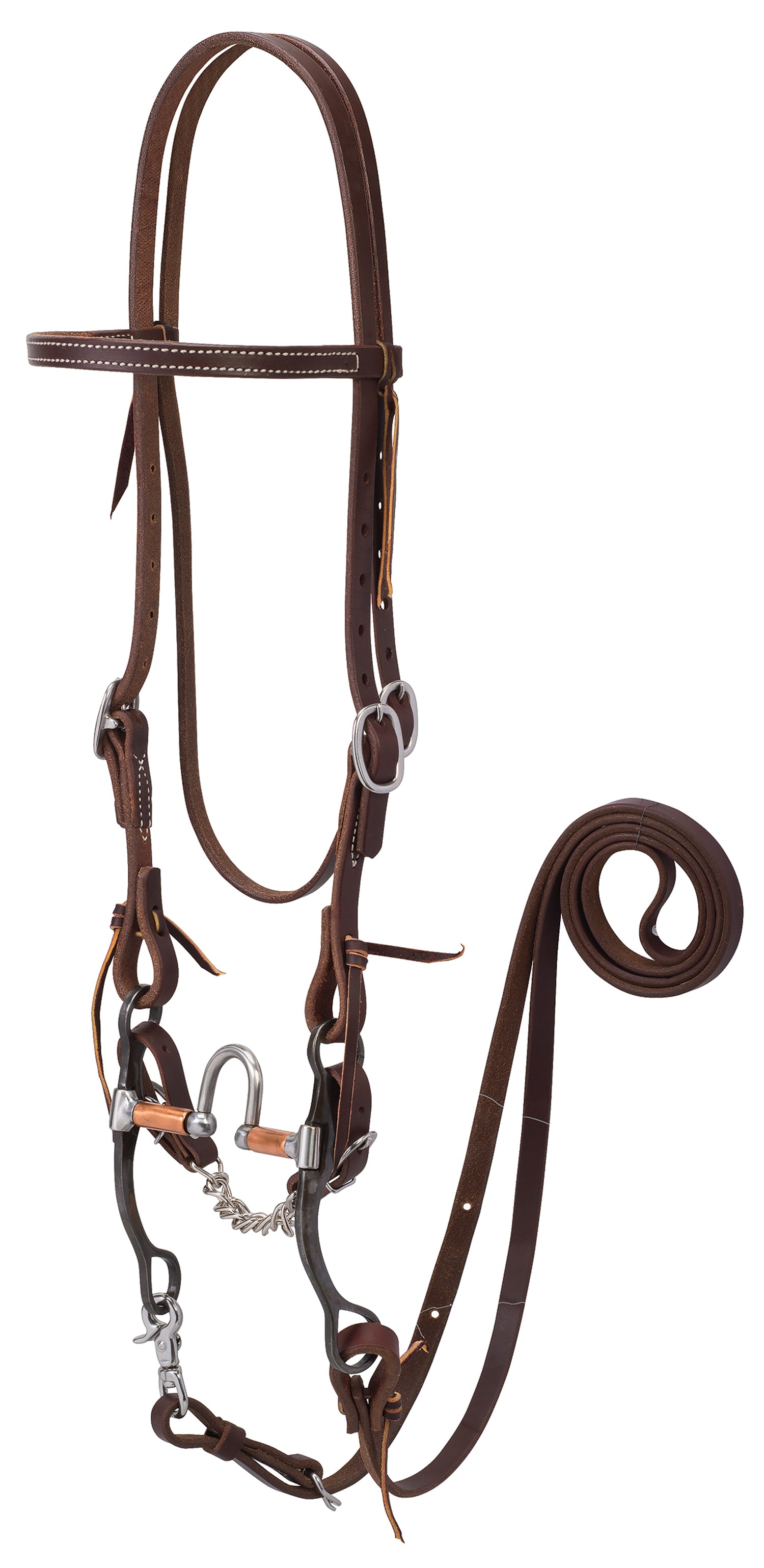 The Weaver Leather® Working Tack Correction Mouth Bridle with premium harness leather is dipped in oil, dressed with butter and hand rubbed for the ultimate in performance and a rich color. Non-rust scissor snap on reins stands up to the most rugged use.